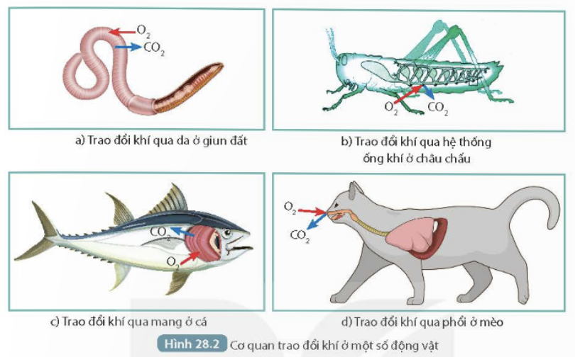 Câu 1: Quan sát Hình 28.2, cho biết tên cơ quan trao đổi khí ở giun đất, cá, châu chấu và mèo.