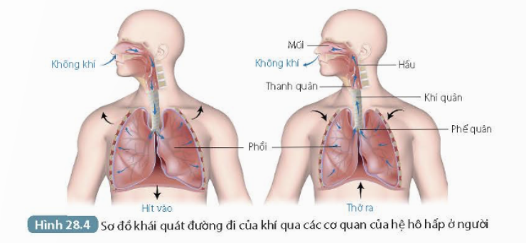 Câu 3: Quan sát Hình 28.4, mô tả đường đi của khí O2 và CO2 qua các cơ quan của hệ hô hấp ở người.