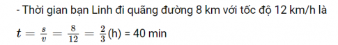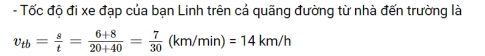 8.7. Bạn Linh đi xe đạp từ nhà đến trường, trong 20 min đầu đi được đoạn đường dài 6 km. Đoạn đường còn lại dài 8 km đi với tốc độ 12 km/h. Tốc độ đi xe đạp của bạn Linh trên cả quãng đường từ nhà đến trường là