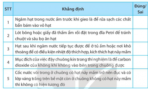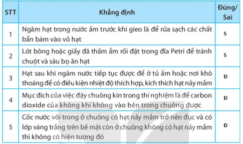 27.3. Các khẳng định sau đây đúng hay sai khi nói về thí nghiệm chứng minh hô hấp ở thực vật?
