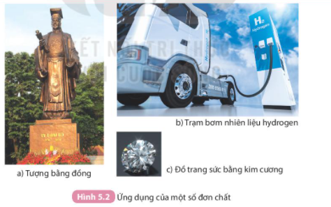 Câu hỏi: Tượng đồng, nhiên liệu hydrogen, đồ trang sức bằng kim cương trong Hình 5.2 là ví dụ về ứng dụng của đồng, hydrogen và carbon. Em hãy kể ra các ứng dụng khác của đồng, hydrogen và carbon mà em biết.