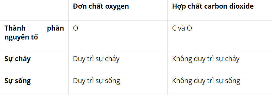 Câu 1: Hãy trình bày sự khác biệt giữa đơn chất oxygen và hợp chất carbon dioxide về thành phần nguyên tố và vai trò của chúng đối với sự sống và sự cháy