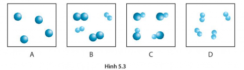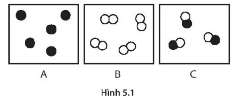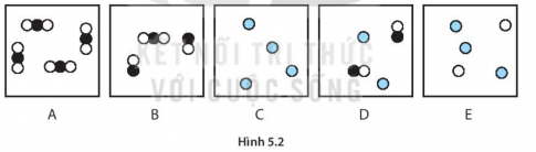 5.9. Trong các hình vẽ dưới đây, mỗi hình vuông biểu diễn một chiếc hộp chứa; mỗi vòng tròn biểu diễn một nguyên tử, các vòng tròn màu đen, xanh lam nhạt và trắng biểu diễn các nguyên tử của các nguyên tố hoá học khác nhau.