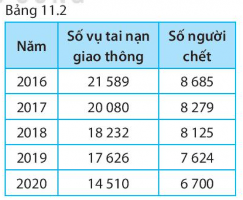 11.6. a) Dựa vào Bảng 11.2, hãy vẽ đồ thịbiểu diễn sự thay đổi về số vụ tai nạn giao thông hằng năm trong bảng thống k ê của Uỷ ban An toàn giao thông Quốc gia: