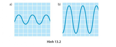 13.12. Có hai chiếc micro được kết nối với máy hiện sóng, dao động kí do âm thanh phát ra từ loa thứ nhất và loa thứ hai lần lượt được ghi trong Hình 13.2a và 13.2b. Hãy so sánh biên độ và tần số dao động của hai âm thanh này.
