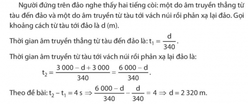 14.7*. Một người đứng trên mép hòn đảo cách vách núi phía trước 3 000 m, giữa vách núi và hòn đảo có một chiếc tàu thuỷ neo đậu (Hình 14.2). Khi tàu hú còi, người này nghe thấy hai tiếng còi cách nhau 4 s. Xác định khoảng cách từ tàu tới đảo. Biết tốc độ truyền âm trong không khí là 340 m/s.