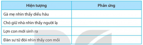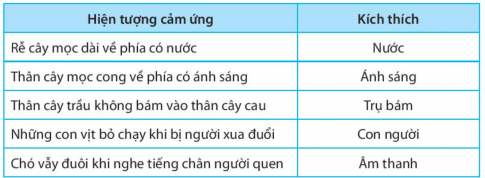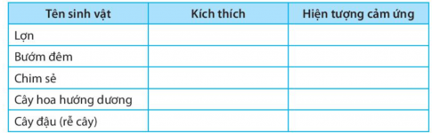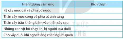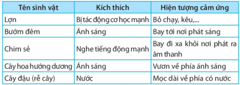 33.4. Quan sát các hiện tượng cảm ứng của một số sinh vật thường gặp trong thực tiễn và hoàn thành các thông tin vào bảng theo mẫu sau: