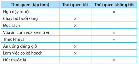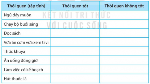 33.9. Hãy phân biệt các thói quen trong bảng sau vào nhóm thói quen tốt và không tốt. Lập kế hoạch để hình thành các thói quen tốt mà bản thân chưa có.