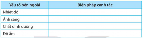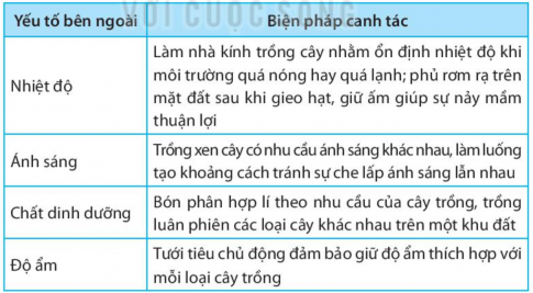 37.5. Vận dụng kiến thức về ảnh hưởng của các yếu tố bên ngoài tác động đến quá trình sinh trưởng và phát triển của thực vật, hãy đề xuất các biện pháp canh tác giúp cây trồng sinh trưởng tốt, cho năng suất cao theo mẫu sau: