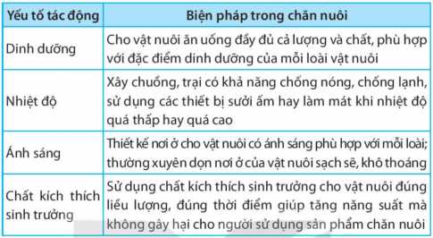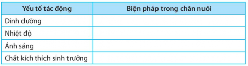 37.7. Vận dụng kiến thức về các yếu tố ảnh hưởng đến sinh trưởng và phát triển của sinh vật, em hãy đề xuất các biện pháp trong chăn nuôi để vật nuôi sinh trưởng tốt, cho năng suất cao theo mẫu sau: