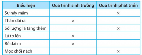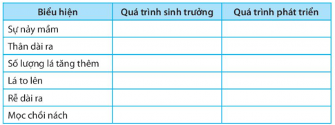 38.3. Thông qua hoạt động gieo hạt và theo dõi sự biến đổi của cây từ giai đoạn hạt đến cây trưởng thành, em hãy phân biệt biểu hiện của quá trình sinh trưởng và phát triển ở thực vật theo mẫu sau: