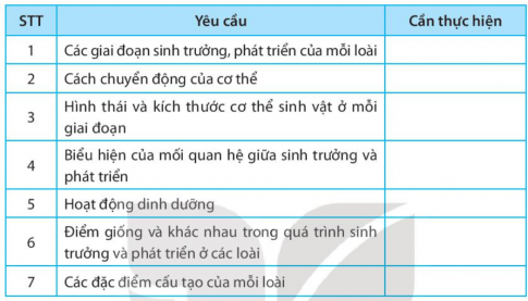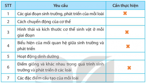 38.4. Khi quan sát, mô tả sự sinh trưởng và phát triển ở một số động vật qua tranh ảnh, video, cần thực hiện các yêu cầu nào trong số các yêu cầu trong bảng sau: