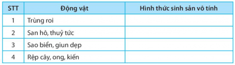 39.4. Các loài động vật trong bảng sau sinh sản vô tính bằng hình thức nào?