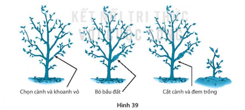 39.6. Hình 39 mô tả quy trình của phương pháp chiết cành. Quan sát hình và giải thích tại sao sau khi bó bầu đất vào vết khoanh vỏ, rễ chỉ có thể mọc ra từ mép vỏ phía trên của vết cắt.