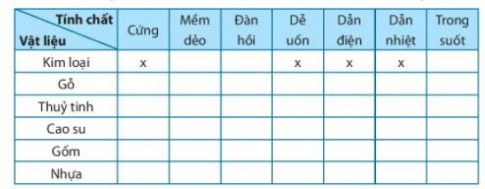 Câu 12.6. Em hãy liệt kê tính chất của các vật liệu theo mẫu dưới đây: