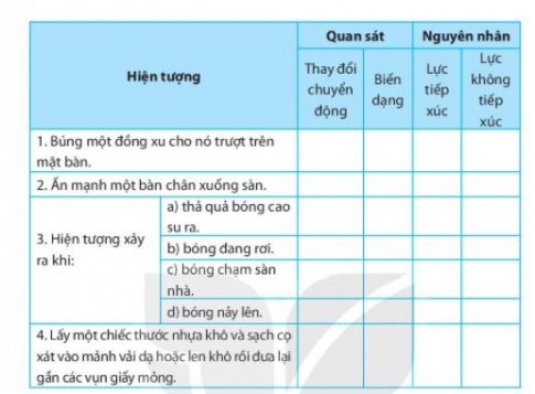 Câu 40.5*. Hãy nhận xét về các hiện tượng sau đây bàng cách dùng bút chì đánh dấu x cho mỗi kết luận đúng vào các ô trống trong bảng: