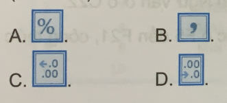 Nút lệnh ở phương án A là chuyển thành định dạng số phần trăm, nút lệnh ở phương án B là tách hàng phần nghìn với dấu phân tách mặc định (dấu phẩy hoặc dấu chấm), nút lệnh ở phương án là tăng số chữ số ở phần thập phân.