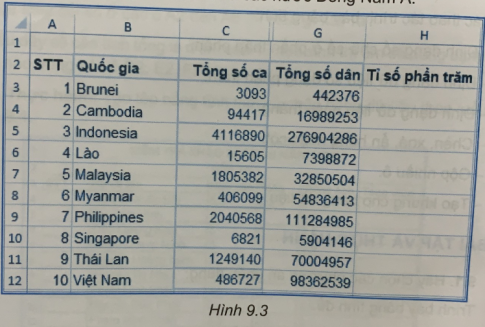 9.4. Thực hành: Hình 9.3 là bảng tính chứa thông tin về tình hình dịch Covid-19 tính đến ngày 3/9/2021 của các nước Đông Nam Á