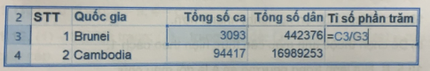 b) Tính tỉ số phần trăm tổng số ca nhiễm bệnh trên tổng số dân vào cột Tỉ số phần trăm cho các ô và định dạng cho phù hợp.