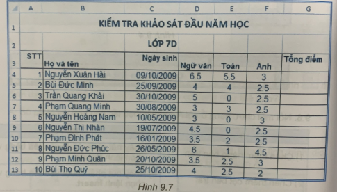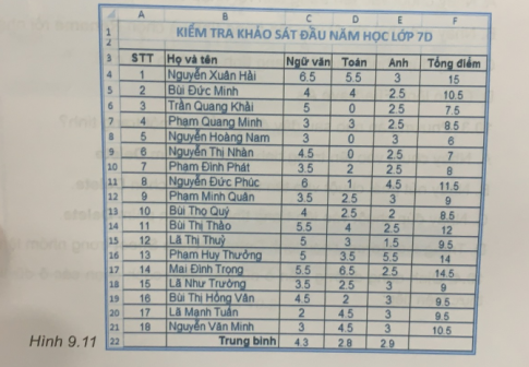 9.11. Thực hành: Mở lại tệp Bangdiem.xlsx và trình bày lại theo mẫu như Hình 9.11