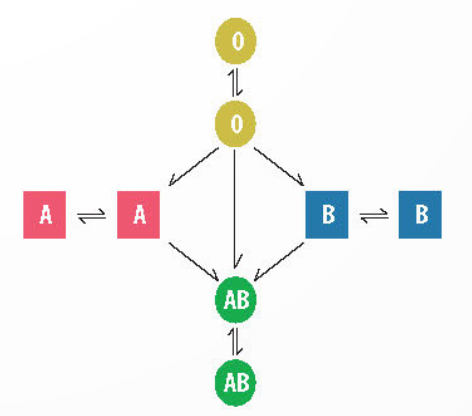 Câu hỏi 1. Vẽ Hình 33.4 vào vở rồi hoàn thành sơ đồ truyền máu bằng cách đánh dấu chiếu mũi tên để thể hiện mối quan hệ cho, nhận giữa các nhóm máu.