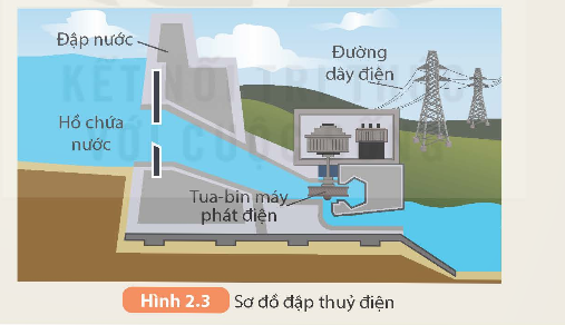 Hoạt động: Để dự trữ năng lượng, người ta xây dựng những đập nước ngăn các dòng chảy để tạo thành những hố chứa nước. Nước trong hồ chứa càng nhiều và ở càng cao thì năng lượng tích trữ càng lớn. Hãy giải thích vì sao để khai thác được tối đa thế năng của nước trong hồ chứa, người ta thường bố trí sao cho vị trí đặt máy phát điện càng thấp so với mực nước hồ chứa (Hình 2.3).
