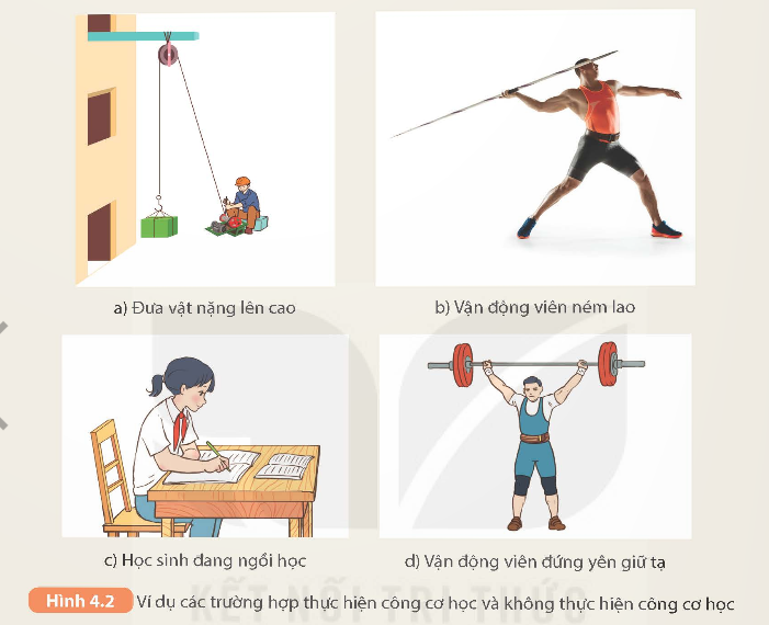 Hoạt động: Hãy mô tả quá trình thực hiện công trong các ví dụ ở Hình 4.2 thông qua việc xác định lực tác dụng lên vật và quãng đường vật di chuyển theo hướng của lực để cho biết trong trường hợp nào có công cơ học, trường hợp nào không có công cơ học.