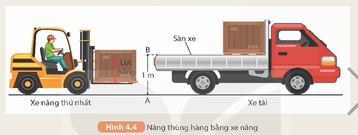 Hoạt động: Hai xe nâng được dùng để nâng hai thùng hàng từ mặt đất (điểm A) tới sàn một xe tải có độ cao 1 m (điểm B). Xe thứ nhất nâng thùng hàng có trọng lượng 500 N hết thời gian 10 s (Hình 4.4). Xe thứ hai nâng thùng hàng có trọng lượng 700N hết thời gian 15 s.