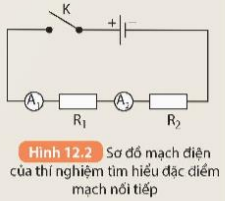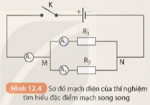 - Mắc hai điện trở và ba ampe kế vào mạch điện theo sơ đồ Hình 12.4.