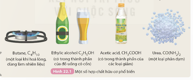 Hoạt động: Quan sát công thức của các hợp chất hữu cơ phổ biến trong Hình 22.1 và cho biết đặc điểm chung về thành phần nguyên tố của các phân tử hợp chất hữu cơ là gì?