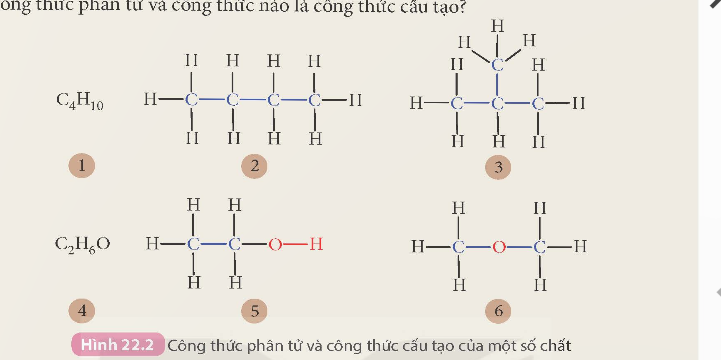 Hoạt động 1: Em hãy cho biết các công thức từ 1 đến 6 trong Hình 22.2, công thức nào là công thức phân tử và công thức nào là công thức cấu tạo?