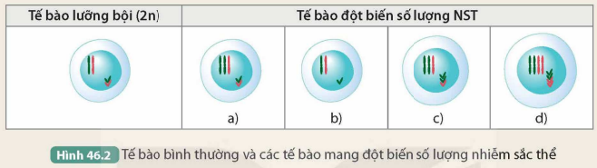 1. Nhận xét sự thay đổi số lượng NST trong mỗi tế bào đột biến (Hình 46.2 a, b, c, d) so với tế bào lưỡng bội.