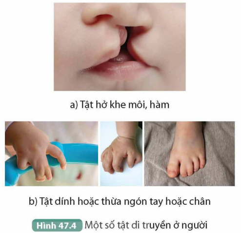Câu hỏi 1: Đọc thông tin trong mục II và quan sát các Hình 47.2, 47.3, 47.4, cho biết đặc điểm nào giúp phân biệt bệnh và tật di truyền.