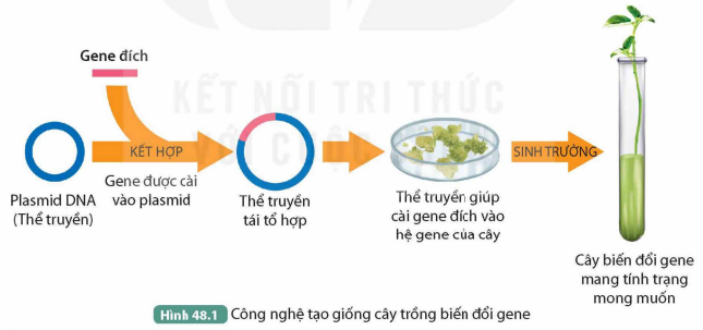 Câu hỏi 1: Quan sát Hình 48.1, mô tả quá trình tạo cây biến đổi gene nhờ ứng dụng công nghệ di truyền.
