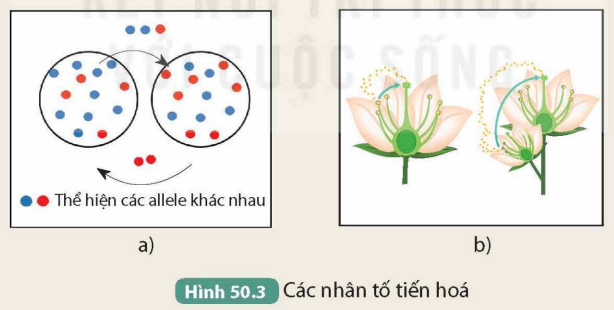 Câu hỏi 2: Xác định nhân tố tiến hóa được thể hiện trong Hình 50.3a và 50.3b.