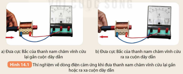 Quan sát sự thay đổi của kim điện kế khi đưa cực Bắc của thanh nam châm vĩnh cửu lại gần hoặc ra xa cuộn dây dẫn (Hình 14.1a và Hình 14.1b).