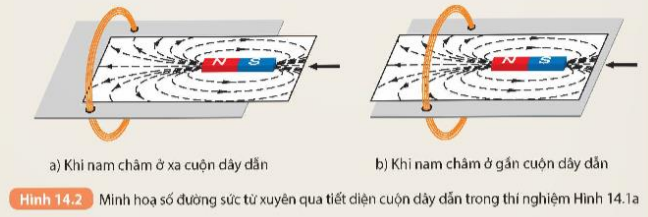 Câu hỏi 2: Trong trường hợp thí nghiệm như Hình 14.1b thí số đường sức từ xuyên qua tiết diện của cuộn dây biến thiên như thế nào?