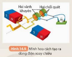 Câu hỏi 2: Hình 14.9 minh họa trường hợp khung dây quay trong từ trường đều để tạo ra dòng điện xoay chiều. Vành khuyên là vòng tròn bằng đồng; chổi quét là lá đồng. Quan sát Hình 14.9 và cho biết cách dẫn dòng điện xoay chiều xuất hiện trong khung dây quay trong từ trường đều ra mạch ngoài như thế nào?