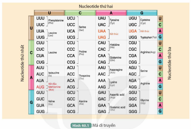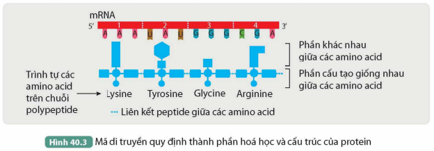 Câu hỏi 1: Quan sát Hình 40.3 cho biết mã di truyền quy định thành phần hóa học và cấu trúc của protein như thế nào.