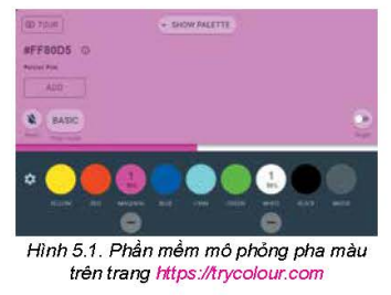 Phần mềm mô phỏng màu (Hình 5.1) cho phép em chọn màu, tăng tỉ lệ các màu và giúp em nhìn thấy màu kết quả được tạo ra trên màn hình. Em hãy cho biết việc sử dụng phần mềm mô phỏng pha màu để tập pha màu và tìm hiểu về màu sắc có những lợi ích gì?