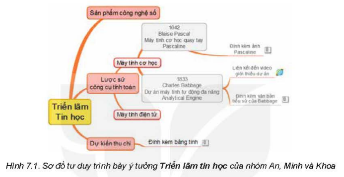 Câu 2: Em hãy nêu những cách mà nhóm bạn An, Minh, Khoa sử dụng sơ đồ tư duy ở hình 7.1 trong trao đổi và hợp tác để hoàn thành công việc chuẩn bị nội dung Lược sử công cụ tính toán cho Triển lãm tin học