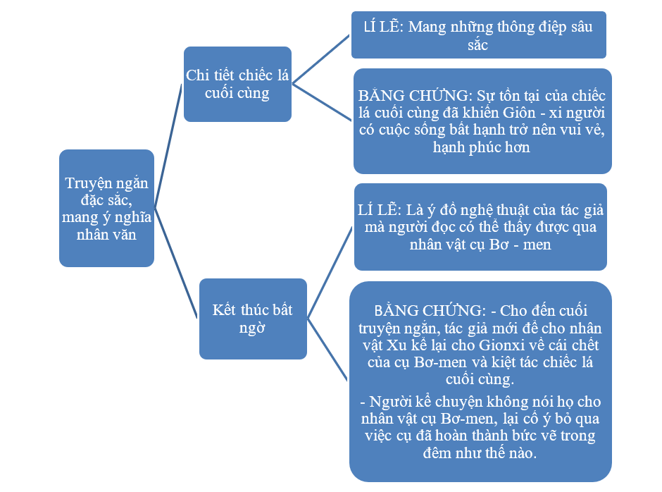 Đưa ra lí lẽ là những lí giải, phân tích tác phẩm. | - Chi tiết chiếc lá cuối cùng - Cái kết đầy bất ngờ | Dẫn chứng các chi tiết nổi bật từ văn bản |
