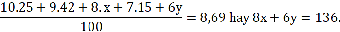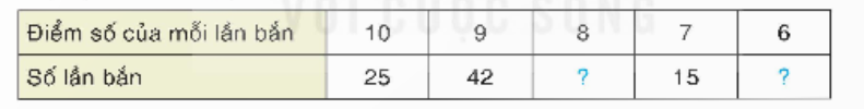 Điểm số trung bình của một vận động viên bắn súng sau 100 lần bắn là 8,69 điểm. Kết quả cụ thể được ghi trong bảng sau, trong đó có hai ô bị mờ không đọc được (đánh dấu “?”):