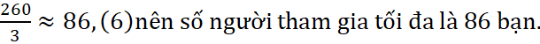 Một nhà tài trợ dự kiến tổ chức một buổi đi dã ngoại tập thể nhằm giúp các bạn học sinh vùng cao trải nghiệm thực tế tại một trang trại trong 1 ngày (từ 14h00 ngày hôm trước đến 12h00 ngày hôm sau). Cho biết số tiền nhà tài trợ dự kiến là 30 triệu đồng và giá thuê các dịch vụ và phòng nghỉ là 17 triệu đồng 1 ngày, giá mỗi suất ăn trưa, ăn tối là 60 000 đồng và mỗi suất ăn sáng là 30 000 đồng. Hỏi có thể tổ chức cho nhiều nhất bao nhiêu bạn tham gia được?